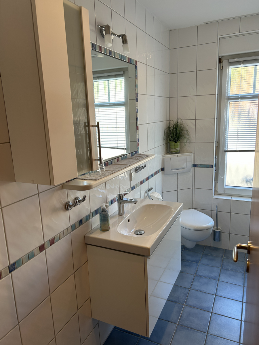 Schlafzimmer (mit Doppelbetten) und Bad mit Dusche und WC.