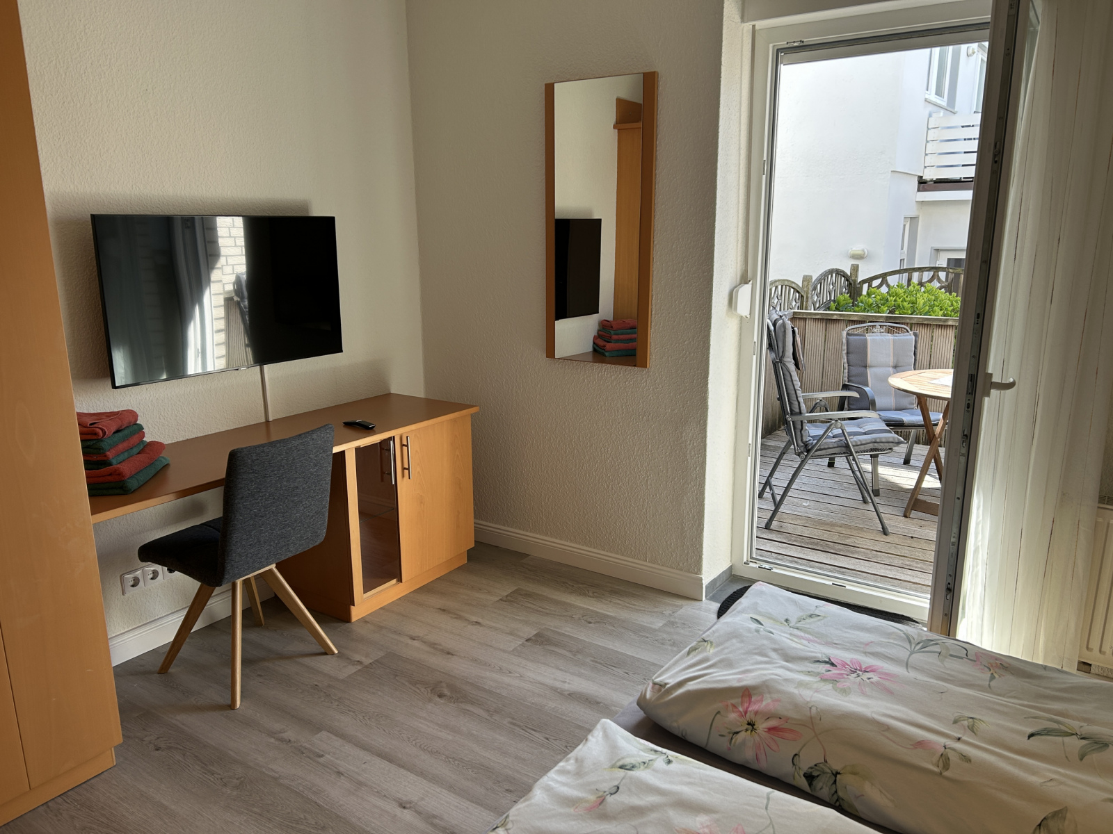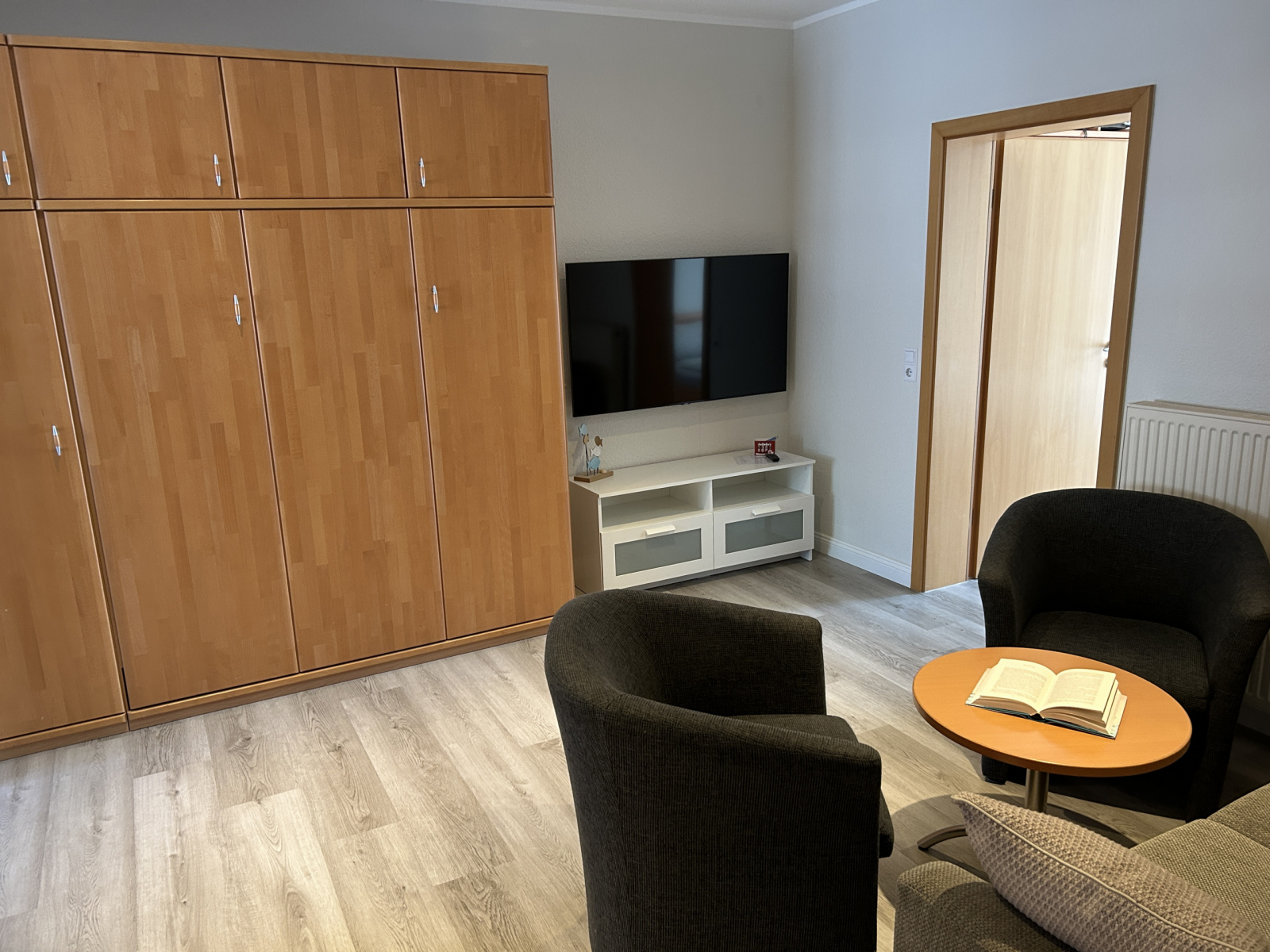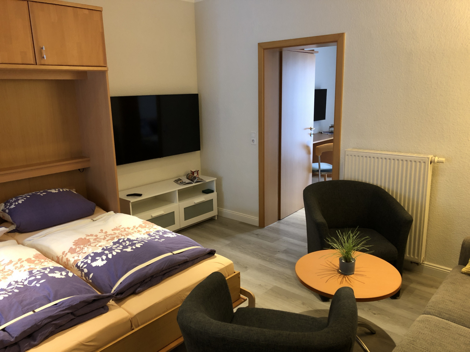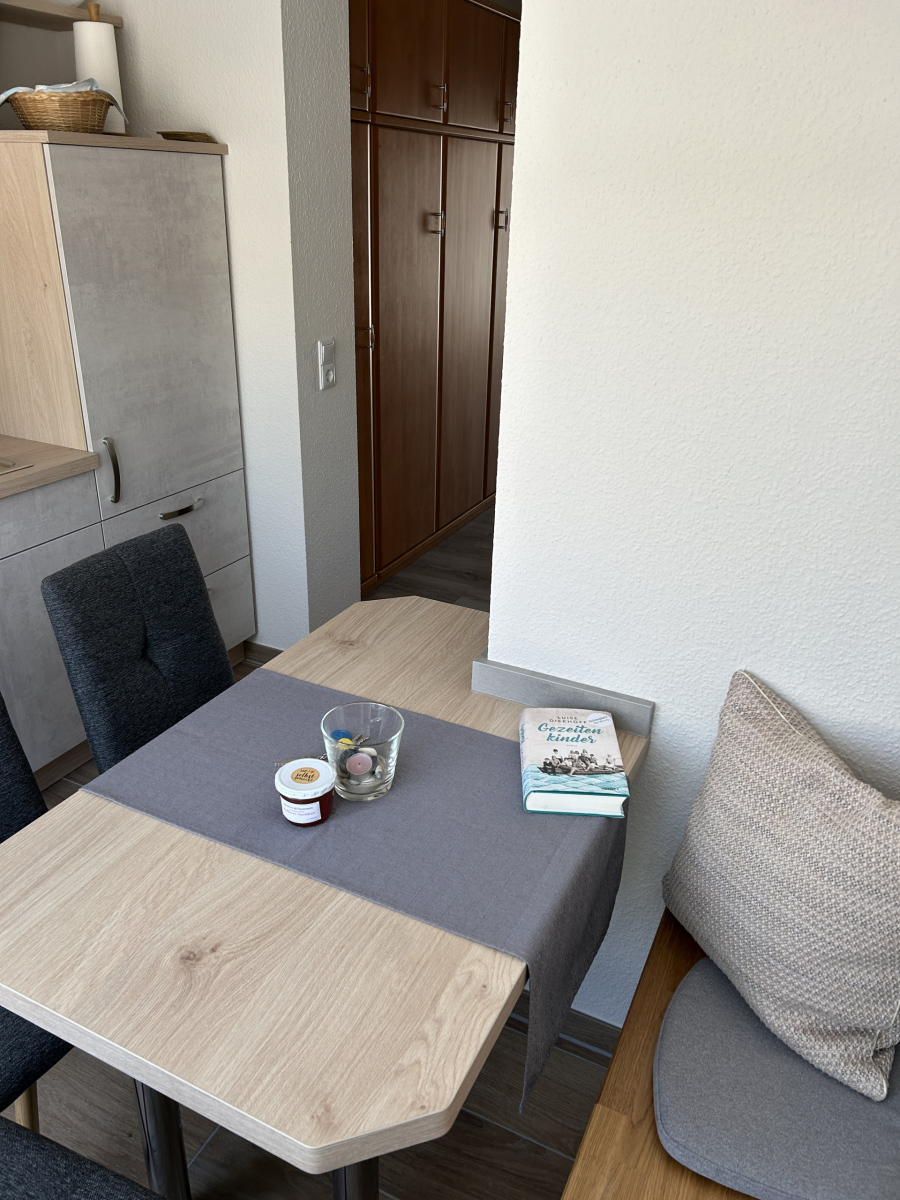 Raumeinteilung: eigene Terrasse, Wohn-Schlafraum (mit Schrankbetten), separate Küche mit Essplatz,