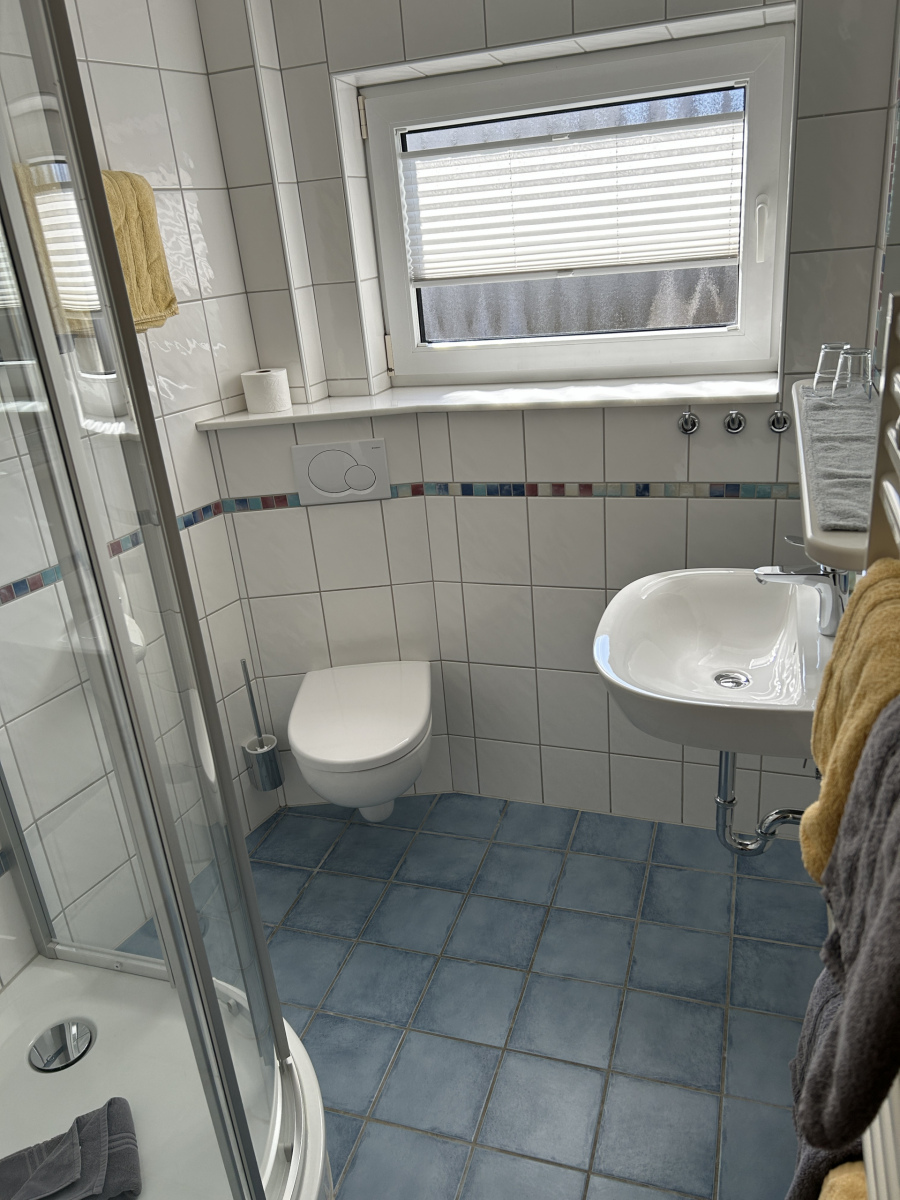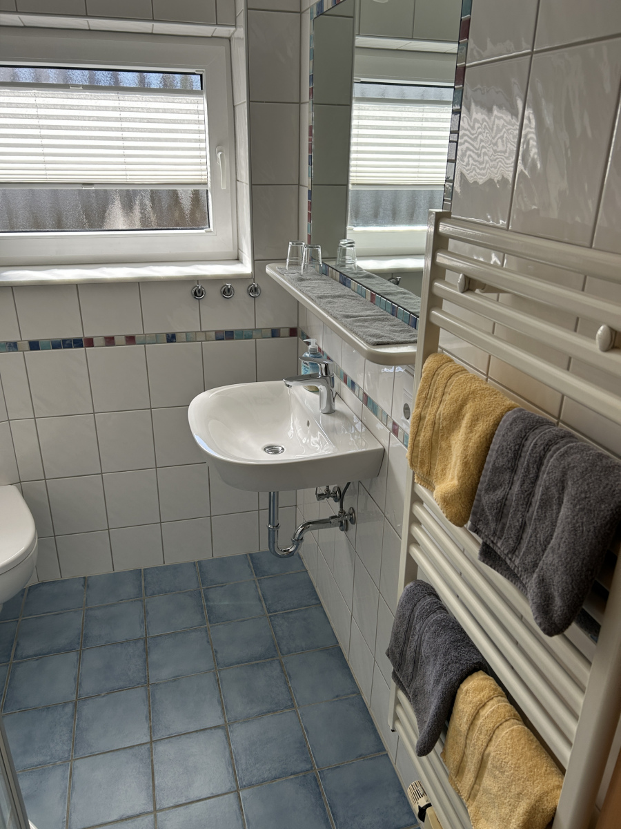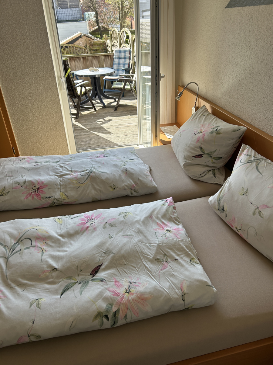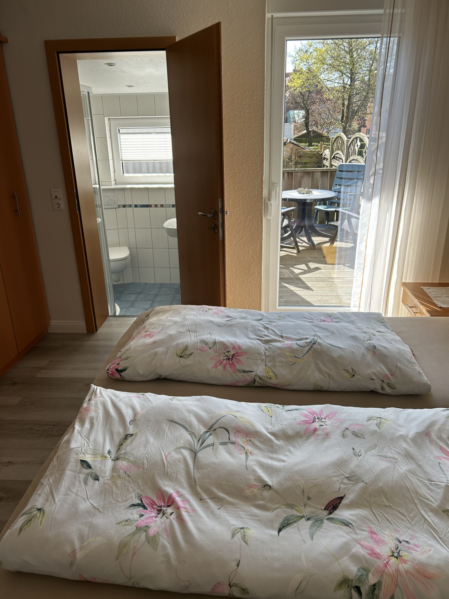 Schlafzimmer (mit Doppelbetten) und Bad mit Dusche und WC.