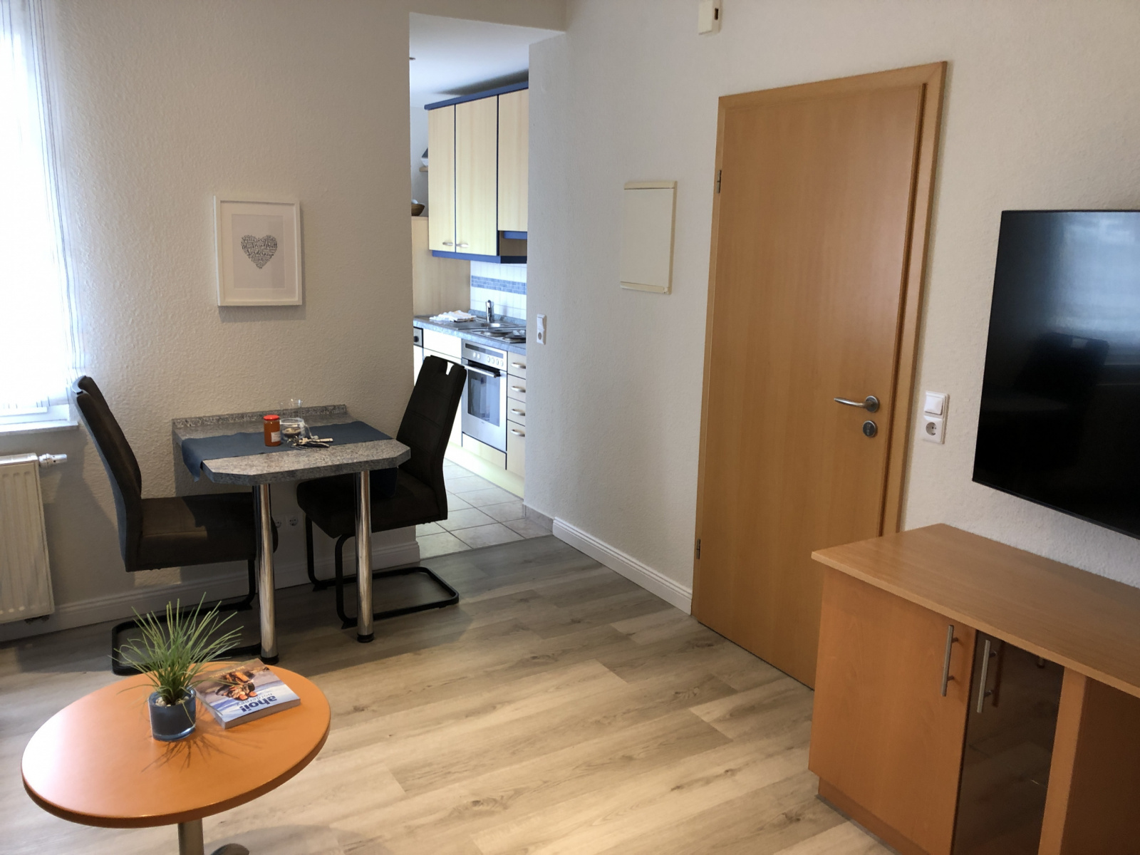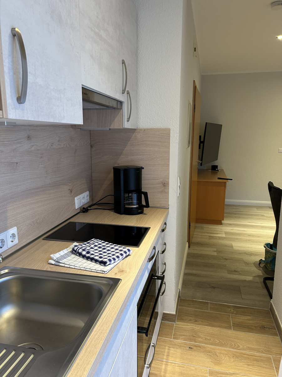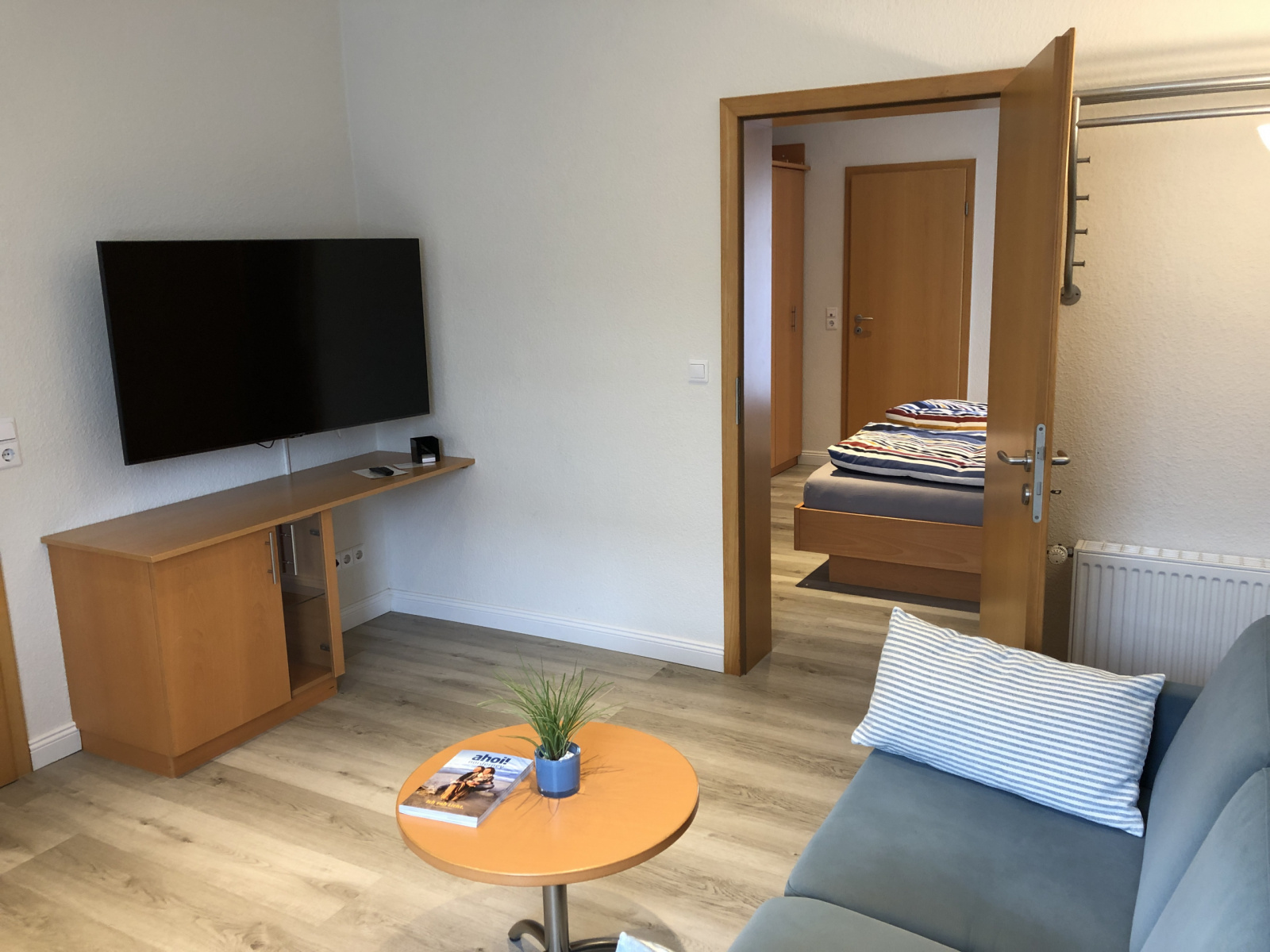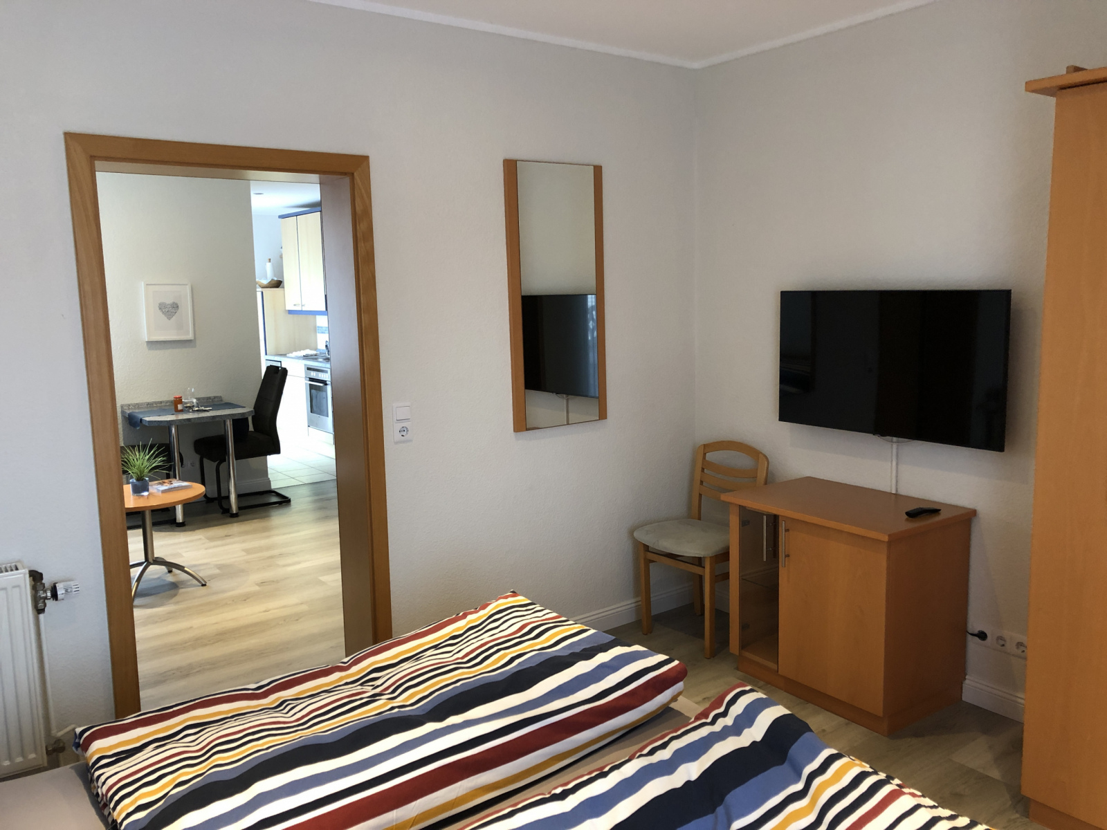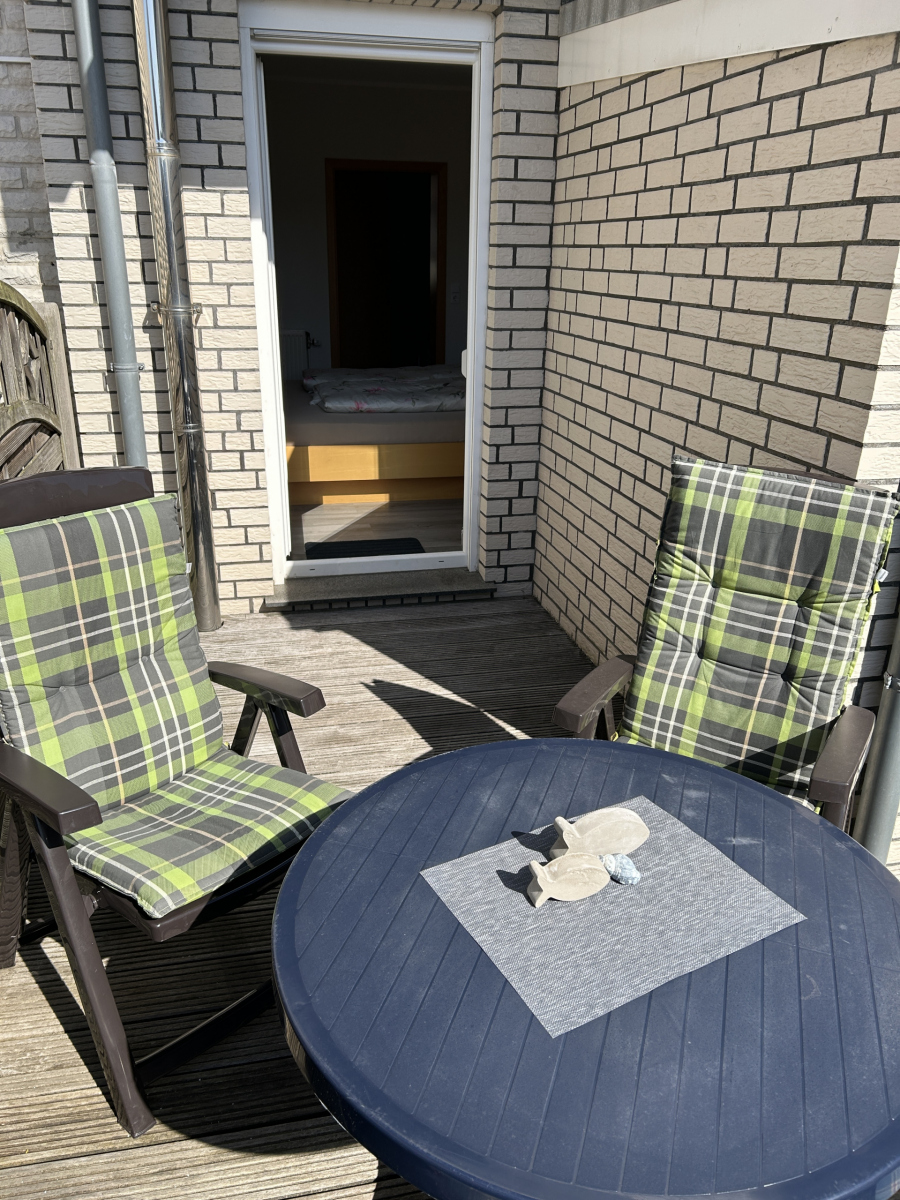 Raumeinteilung: eigene Terrasse, Wohn-Schlafraum (mit Schlafcouch) und Essplatz, separate Küche,