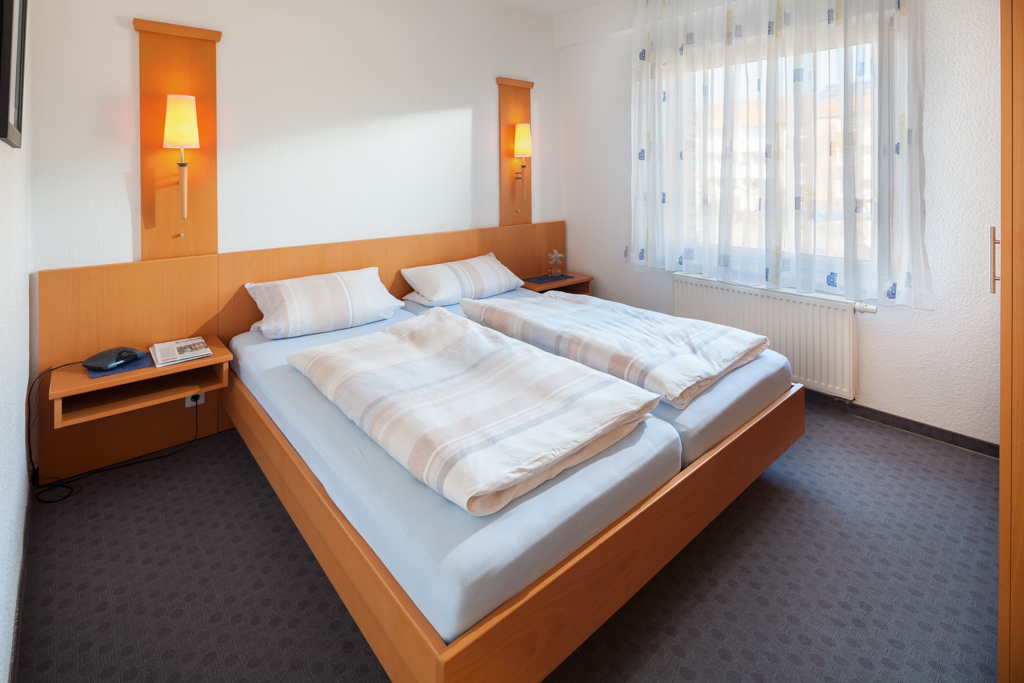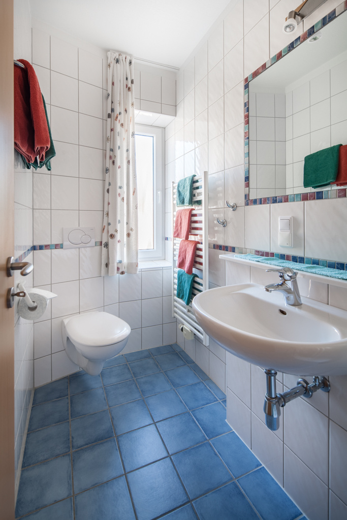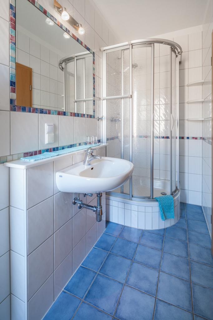 Schlafzimmer (mit Doppelbetten) und Bad mit Dusche und WC.